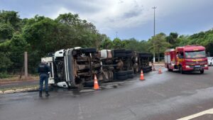 Caminhão com carga de carne tomba em rotatória no Parque dos Poderes em Campo Grande