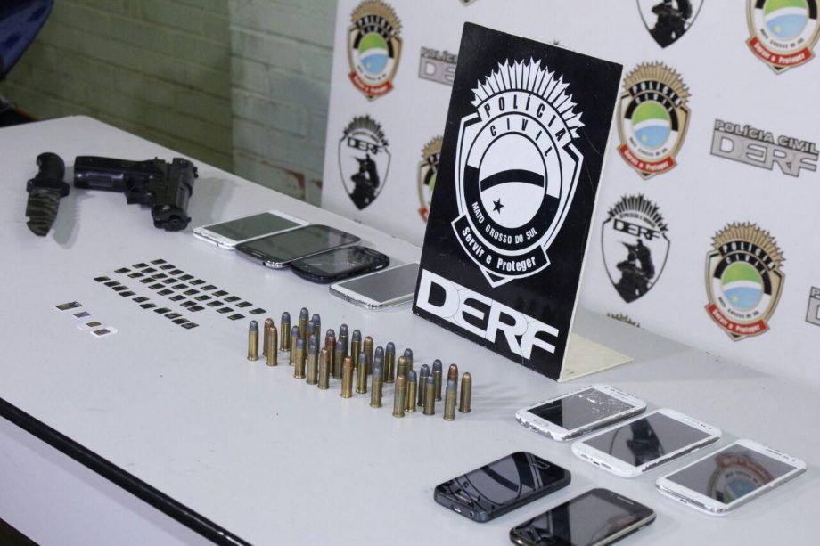 Com o trio foram apreendidas 34 munições de calibre 38, 11 aparelhos de celulares, um simulacro (arma de brinquedo) .40, uma faca, 38 cartões de memória, quatro chips de telefone e a Honda Titan 150, azul, placa HSN-3733, de Campo Grande (MS).