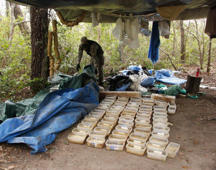 Ainda de acordo com informações, no acampamento havia insumos e elementos para processar cocaína e pasta base, como fogão a gás, vasilhames, produtos químicos, moldes, fitas de embalagem, entre outros. Lá eles encontraram cerca de 55 quilos de cocaína em moldes e 110 pacotes de maconha prensada.