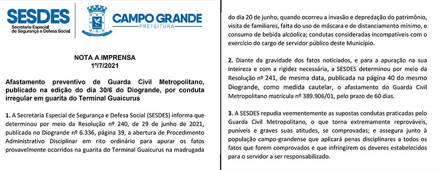 Na nota divulgada, “A SESDES repudia veementemente as supostas condutas praticadas pelo Guarda Civil Metropolitano, o que torna extremamente reprováveis, puníveis e graves suas atitudes, se comprovadas; e assegura junto à população campo-grandense que aplicará penas disciplinares a todos os fatos que forem comprovados e que infringirem os deveres estabelecidos para o servidor a ser responsabilizado”.