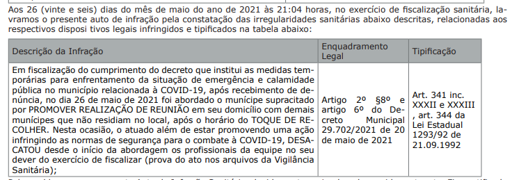 Consta no auto de infração que o médico foi flagrado durante fiscalização do cumprimento do decreto que instituiu medidas temporárias para o enfrentamento da situação da Covid. A Vigilância aponta que recebeu denúncia e abordou o médico em casa, porque estaria promovendo reunião com outras pessoas, que não vivem no local, após o toque de recolher.