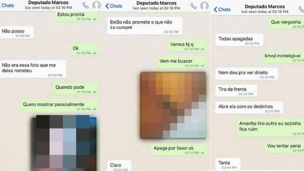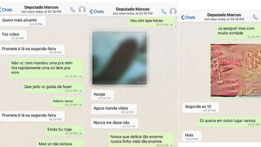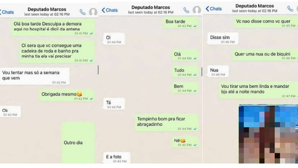 A princípio, sabendo das intenções do deputado, a mulher estaria enviando fotos que não eram dela. Isso, porque precisava da vaga e da assistência para a tia, que estava internada. Ela novamente pede uma foto de Marquinhos, que envia uma selfie. “Agora manda com seu rosto”, diz o deputado, que recebe uma foto da mulher com um menino, dizendo ser o filho dela.