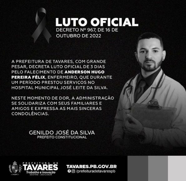A Prefeitura de Tavares, decretou luto oficial de três dias pela morte de Anderson.