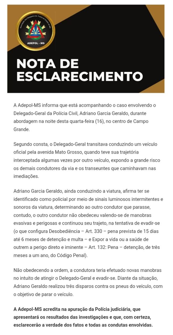 Em notas publicadas na noite de quarta-feira (16), pela Polícia Civil, e na manhã desta quinta-feira (17), sobre o episódio da briga de trânsito com tiros envolvendo o delegado-geral, Adriano Garcia Geraldo, tanto a Adepol (Associação dos Delegados de Polícia de Mato Grosso do Sul), como a PC defenderam a ação do chefe da polícia no Estado.