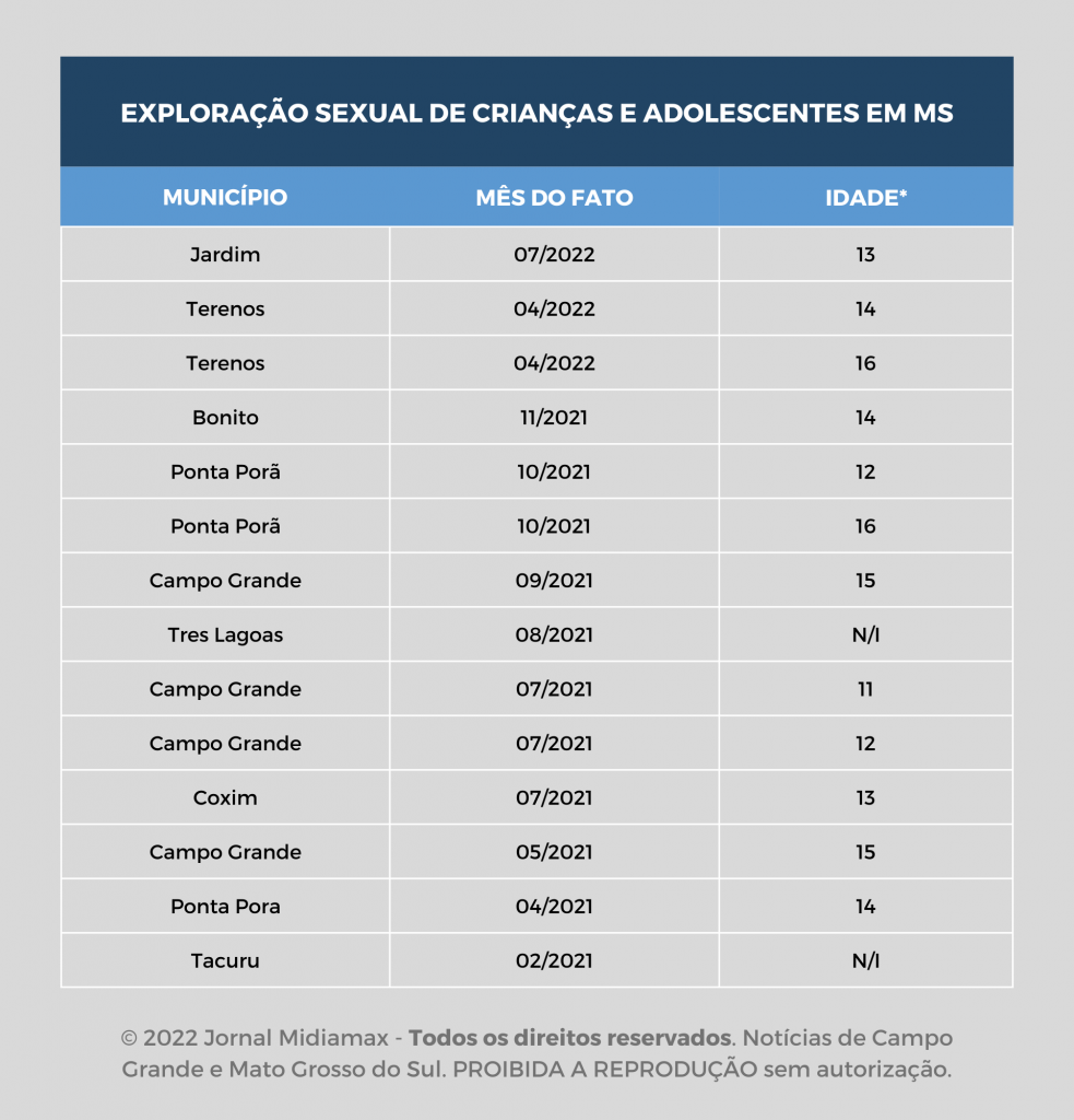 Dados da Sejusp (Secretaria Estadual de Justiça e Segurança Pública) apontam que foram registrados 15 casos de exploração sexual infantil de janeiro até outubro de 2022. A idade das vítimas varia entre 11 e 16 anos, e as cidades com maior número de registros foi Campo Grande, com 5, seguida de Ponta Porã, na fronteira com o Paraguai (3), Terenos (2), e Jardim, Bonito, Três Lagoas, Coxim e Tacuru, com um caso cada.