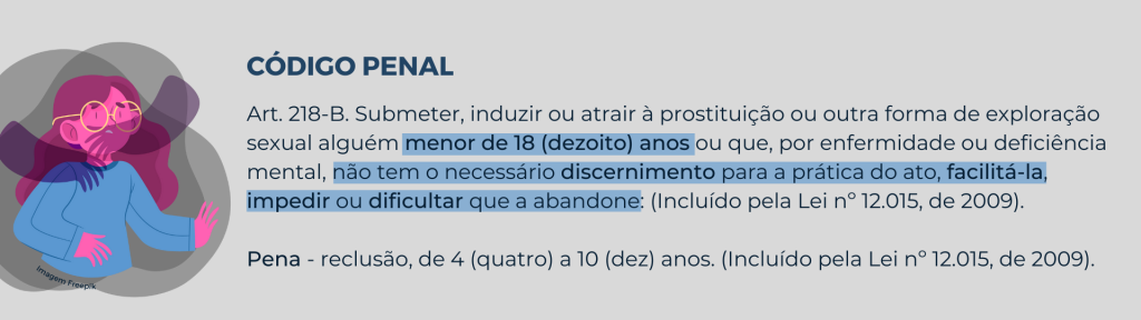 A delegada ainda reforça que o fato da vítima “aceitar” se prostituir é irrelevante para a aplicação da pena e prisão, sendo a pessoa que praticou punida da mesma forma. O artigo 218-B do CP define que o crime é enquadrado como “submeter, induzir ou atrair à prostituição ou outra forma de exploração sexual alguém menor de 18 anos ou que, por enfermidade ou deficiência mental, não tem o necessário discernimento para a prática do ato, facilitá-la, impedir ou dificultar que a abandone”.
