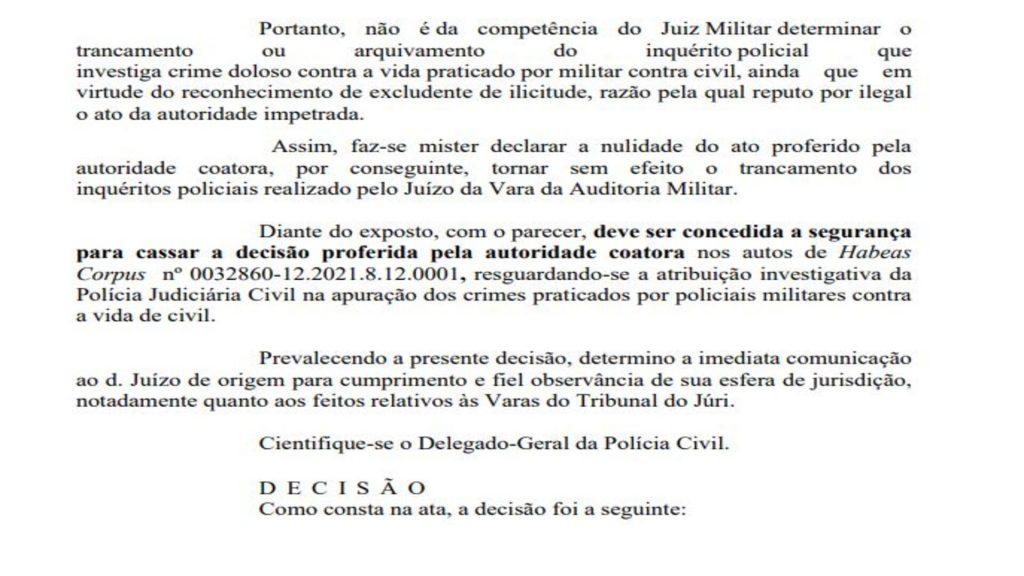 Uma liminar da 1ª Seção Criminal do TJMS (Tribunal de Justiça de Mato Grosso do Sul), da última sexta-feira (14), determinou que os homicídios decorrentes de oposição à intervenção policial – aqueles em que um civil é morto por policial militar em serviço – devem voltar a ser investigados pela Polícia Civil.