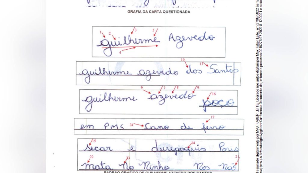 O laudo da perícia anexado ao processo no dia 27 de setembro revela que a carta foi escrita de próprio punho por ‘Gibi’. Os exames foram feitos com auxílio técnico de ampliação como lupa de mão, lupa de ampliação e recursos de informática.
