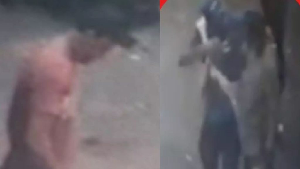 A imagem mostra os dois lado a lado. O suspeito de boné azul e a vítima de camisa clara. Ambos aparentemente embriagados, com latas de bebidas na mão. Em certo momento, o suspeito abraça a vítima e parece consolá-la.
