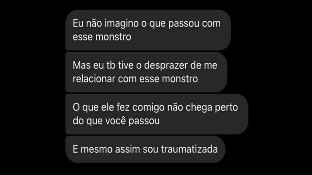 “Ele é extremamente tóxico, abusivo, louco. Inclusive, no domingo tava me mandando msg pedindo para vir me ver. Totalmente desequilibrado (sic)”, relatou outra vítima que se relacionou com o suspeito.