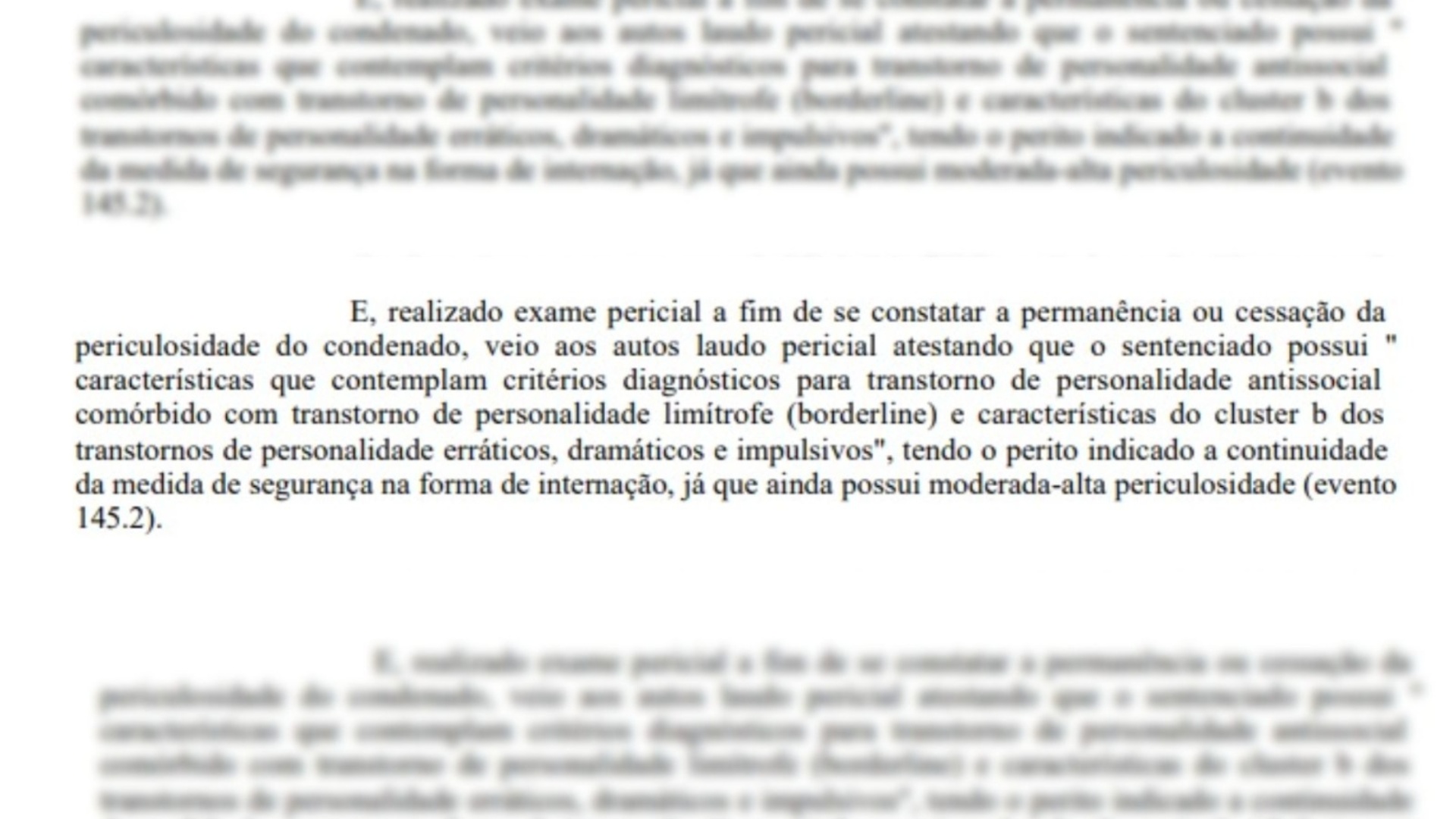 “E, realizado exame pericial a fim de se constatar a permanência ou cessação da periculosidade do condenado, veio aos autos laudo pericial atestando que o sentenciado possui ‘características que contemplam critérios diagnósticos para transtorno de personalidade antissocial comórbido com transtorno de personalidade limítrofe (borderline) e características do cluster b dos transtornos de personalidade erráticos, dramáticos e impulsivos’, tendo o perito indicado a continuidade da medida de segurança na forma de internação, já que ainda possui moderada-alta periculosidade”.
