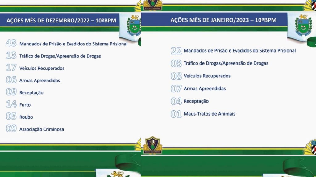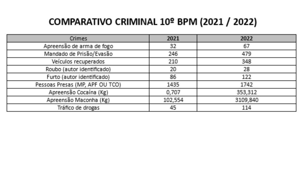 O oficial responsável pelos pelotões do 10º BPM, Rodrigo Real, explicou que a quantidade de apreensões de drogas, de armas, pessoas, além da quantidade de veículos recuperados, de prisões de indivíduos que cometeram roubos e furtos aumentou se comparado com todo o ano de 2021 e 2022. Segundo Rodrigo, essas apreensões se devem ao aumento na quantidade de viaturas rodando na região, de 2 foi para 5 viaturas, sendo que uma delas é a viatura de força tática que foi ativada no ano de 2022 (essa viatura roda com mais policias, em regra 4).