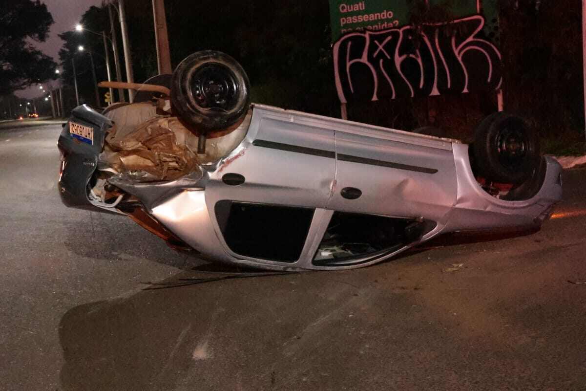 Com o impacto da colisão, o Prisma capotou e parou com as quatro rodas para cima no canto da rua, enquanto o Corsa parou do outro lado da avenida com as rodas para baixo.