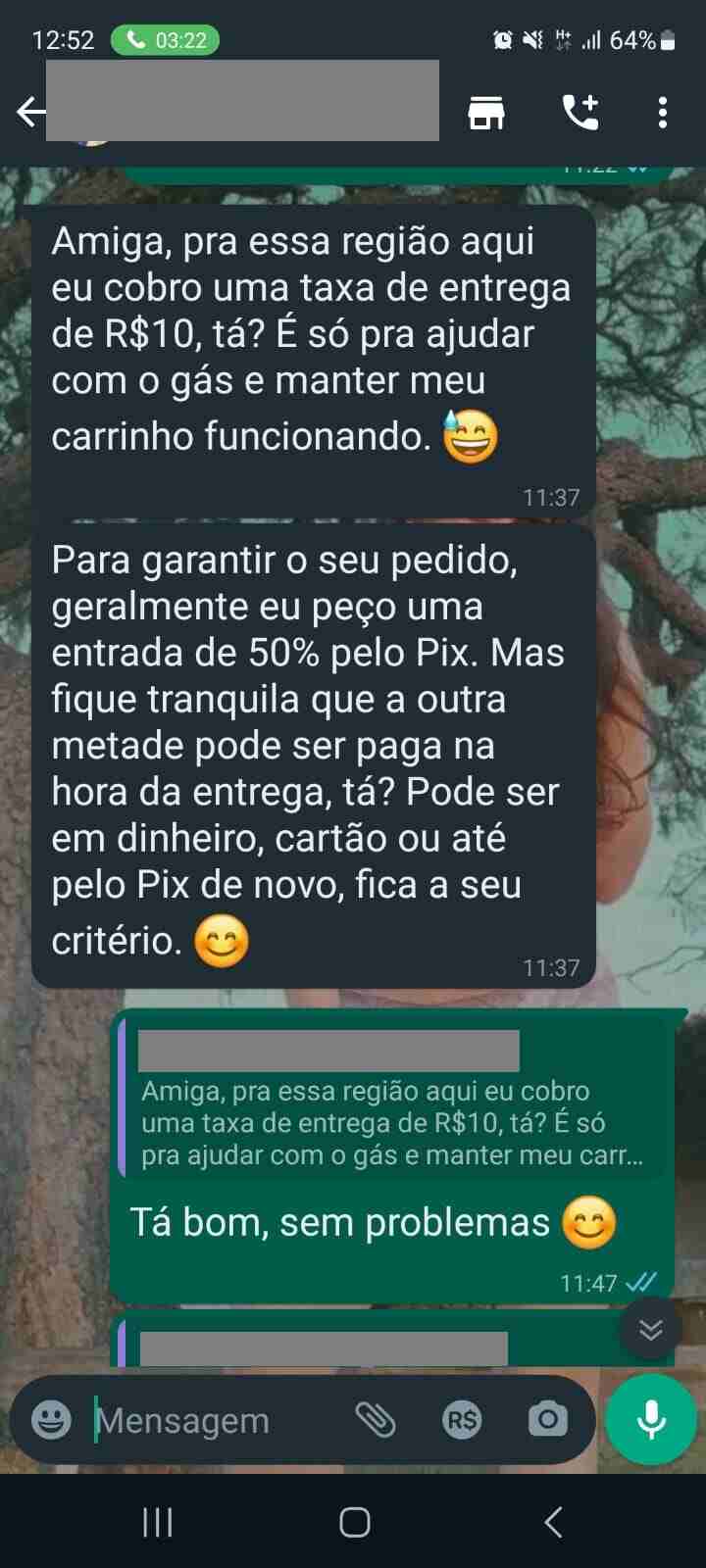 “Amiga, para essa região aqui eu cobro uma taxa de entrega de R$ 10, tá? É só para ajudar com o gás e manter meu carrinho funcionando 😅”, diz a golpista em uma das mensagens.