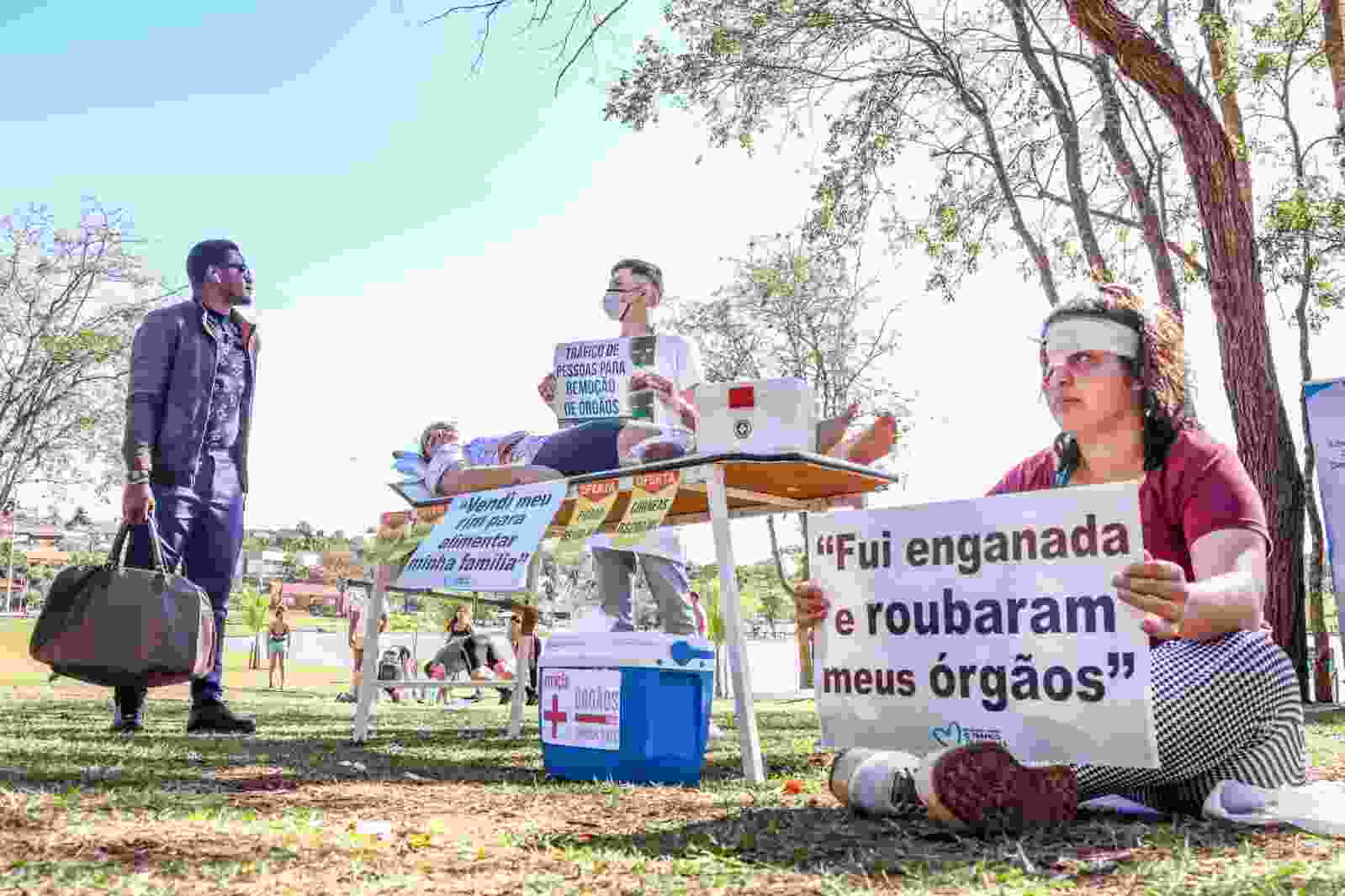 No parque, jovens voluntários estão com encenações de tráfico de órgãos humanos, tráfico análogo ao trabalho escravo, exploração sexual e adoção ilegal de menores.