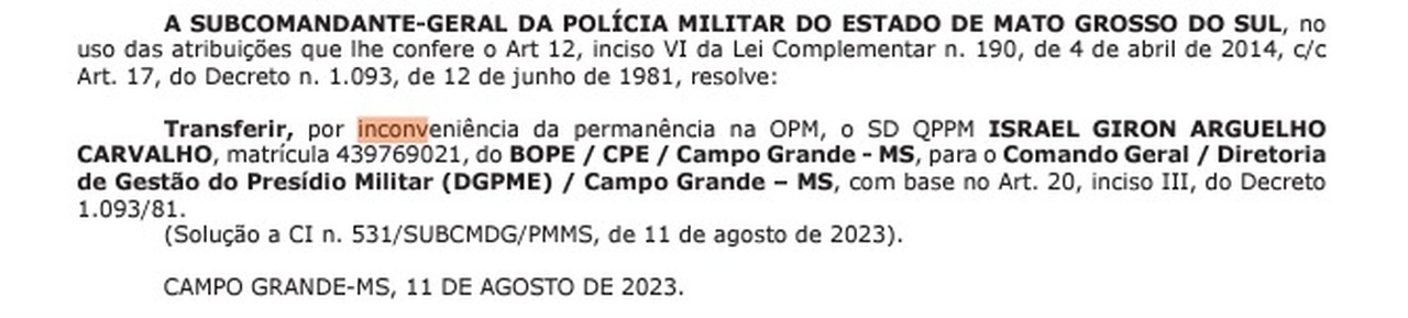 O afastamento dele foi publicado em Diário Oficial nesta segunda-feira (14), mas assinado na última sexta-feira (11), quando o policial foi preso em casa, no Bairro Ana Maria do Couto. “Transferir, por inconveniência de permanência, o soldado do Bope para o Comando Geral/ Presídio Militar”, diz a publicação.