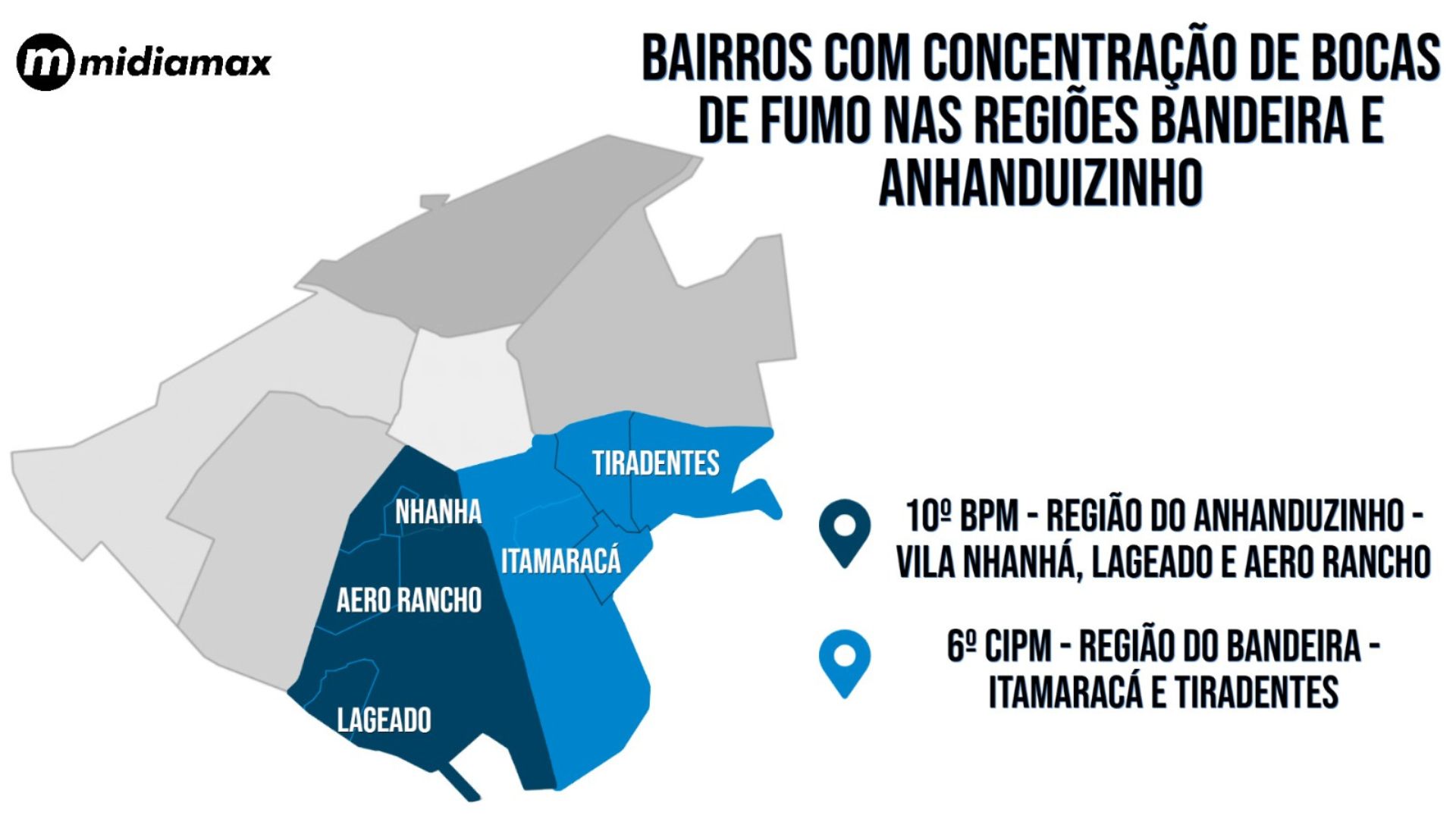 O tenente-coronel ainda explica que, frequentemente, é feito o levantamento de possíveis imóveis abandonados nos bairros a fim de identificar os donos, já que usuários acabam utilizando desses espaços para se esconder e até praticar a venda de drogas. Na região do Anhanduizinho, os três bairros com maior incidência de tráfico de drogas doméstico são Vila Nhanhá, Aero Rancho e Lageado.