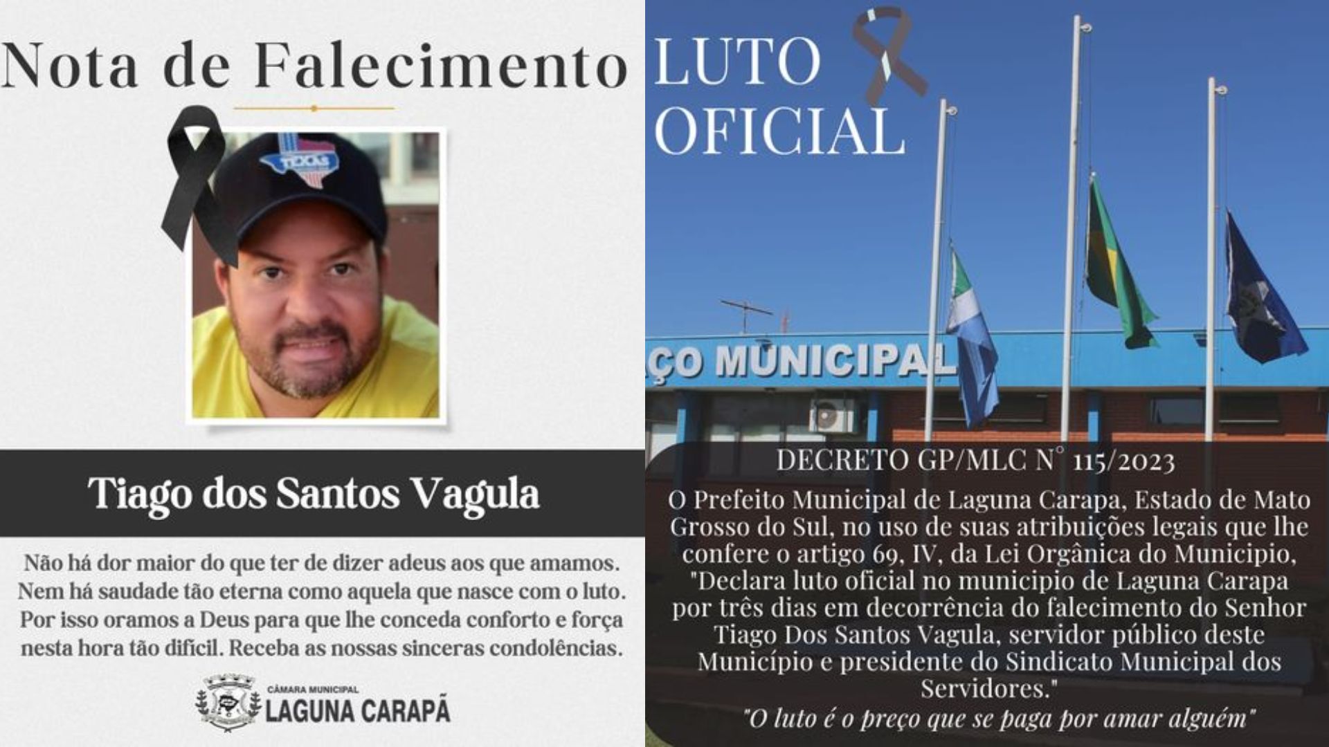 A Câmara Municipal de Laguna Carapã emitiu nota de pesar pela morte do servidor. “É com imenso pesar que informamos o falecimento de Tiago dos Santos Vagula. Uma grande perda que com certeza deixará muitas saudades. Que Deus possa confortar os corações dos familiares e amigos neste momento difícil”, diz.