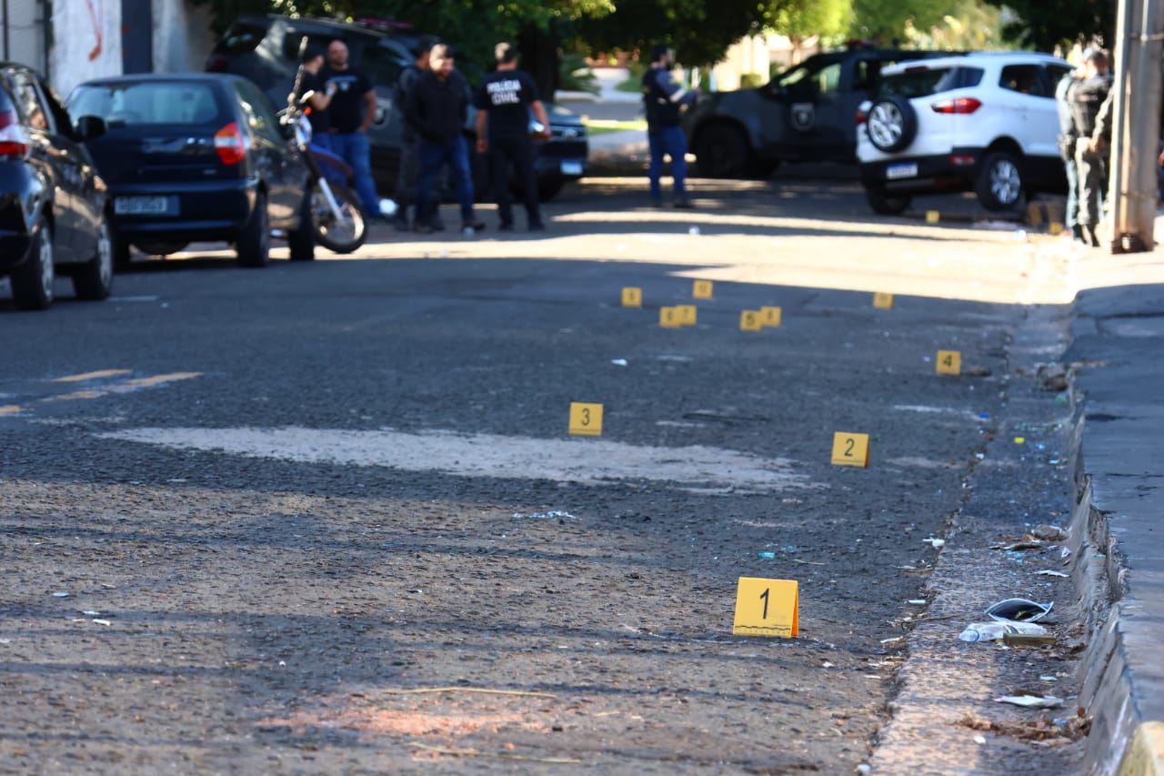 No local há um Ecosport batido ao poste, com o air bag acionado. Informações preliminares indicam que uma briga de trânsito teria se estendido até o trecho, que fica próximo a uma residência. Há marcados 11 cápsulas deflagradas no chão, sendo quatro no veículo.
