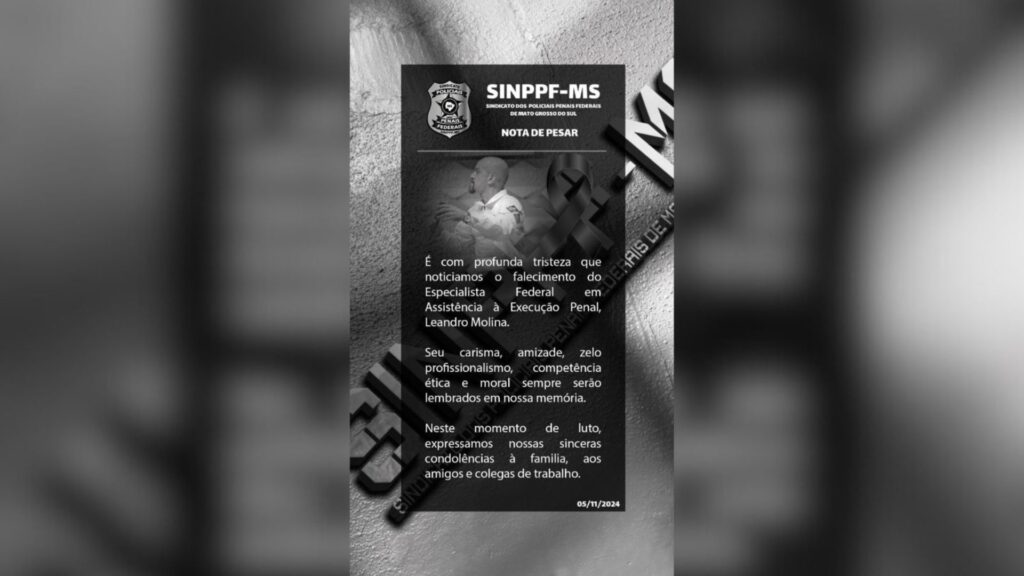 O policial penal federal Leandro Molina, de 40 anos, foi encontrado morto em casa, em Campo Grande, nesta terça-feira (5). Ele era enfermeiro – Especialista Federal em Assistência à Execução Penal. Molina havia feito uma denúncia sobre as condições de trabalho na penitenciária.