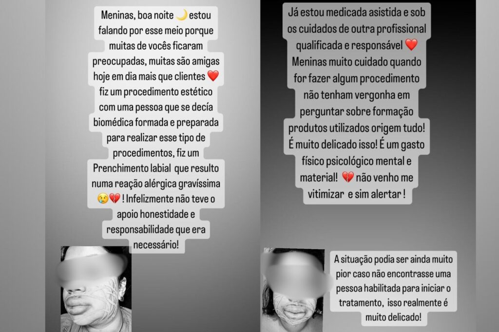 Ainda muito inchada, a manicure disse que fez o procedimento por volta das 16h. Na ocasião, havia feito uma permuta com a estudante de biomedicina, a qual também se identificou como biomédica para ela. “Tenho todos os prints da nossa conversa guardados aqui. Ela iria fazer a minha boca e abater R$ 600 em unhas. Ela não preencheu ficha alguma comigo, mas, por ser algo informal, uma permuta, achei que estava tudo certo. Só que já no mesmo dia comecei a sentir uma dificuldade para respirar, além do lábio muito inflamado”, argumentou.