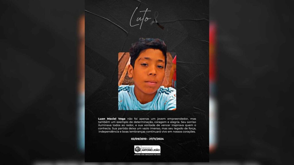 A morte do adolescente também foi confirmada na página oficial da Prefeitura de Antônio João. “Sua partida deixa um vazio enorme, mas seu legado de força e dedicação jamais será esquecido. Desejamos que Deus conforte sua família, amigos e todos que tiveram o privilégio de conhecê-lo. Luan, Sua luz continuará a brilhar em nossos corações”, diz trecho da publicação.