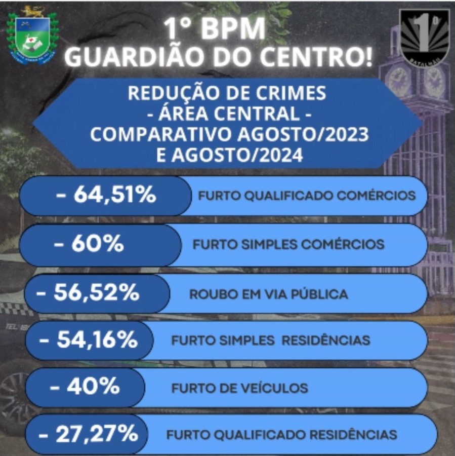 Os números da criminalidade na região Central – principalmente as práticas de furtos e roubos contra pessoas, veículos, residências ou comércios – tiveram redução significativa em agosto, se comparado com o mesmo período do ano passado. Levantamento feito pelo 1° Batalhão de Polícia Militar, responsável pela região, mostra que a maior queda ocorreu nos furtos qualificados em comércios, com queda de 64,51%.