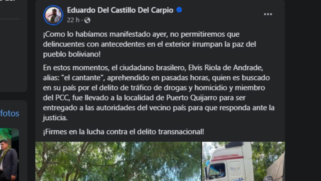 Citou ainda que Elvis era procurado no Brasil por tráfico de drogas e homicídio, além de ser membro do PCC. Ele foi levado para Puerto Quijarro, e entregue a policiais militares de Corumbá, na ponte internacional.