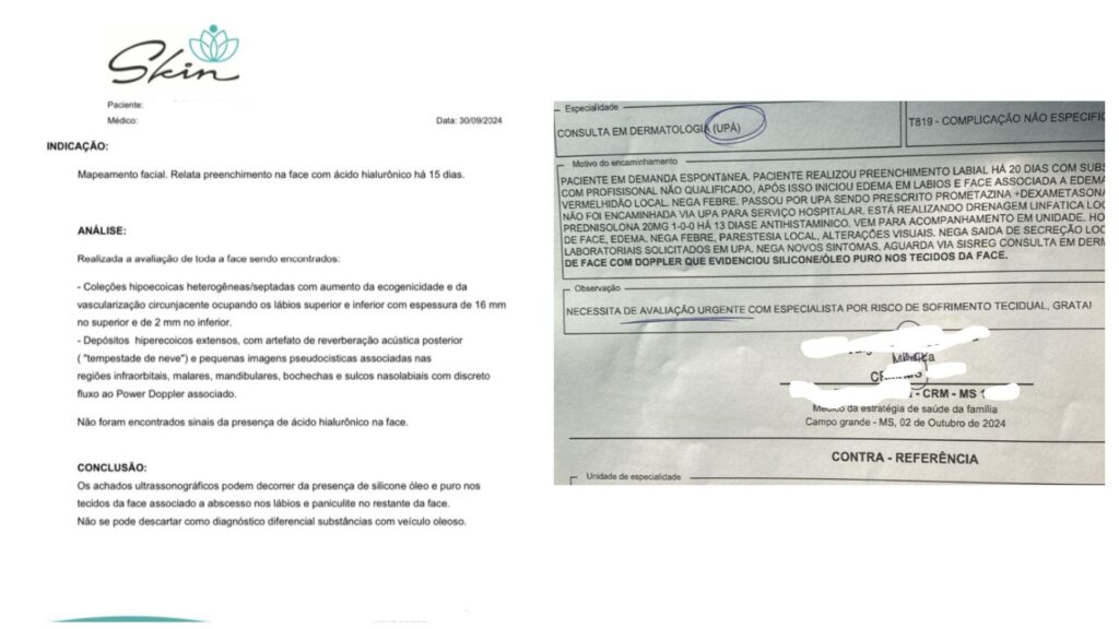 A primeira vítima, que denunciou o crime da falsa biomédica ao Jornal Midiamax está, neste momento, retornando ao hospital, após pagar mil reais em um laudo que apontou silicone injetado na boca. Porém, o material se espalhou em todo o rosto.