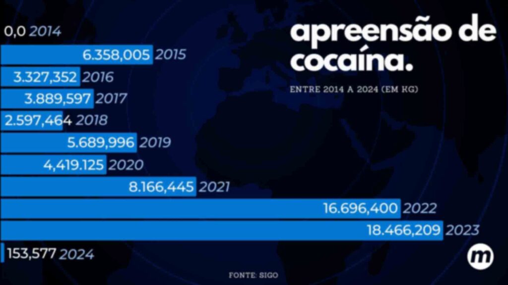 O tráfico de cocaína segue como um desafio significativo para as autoridades de segurança em Mato Grosso do Sul, sendo a segunda maior droga apreendida no Estado. No período de 2015 a 2024, a Sejusp apreendeu 97,63 toneladas da substância. Em paralelo, a PRF realizou apreensões que totalizaram 42,93 toneladas de droga entre 2014 e 2022.