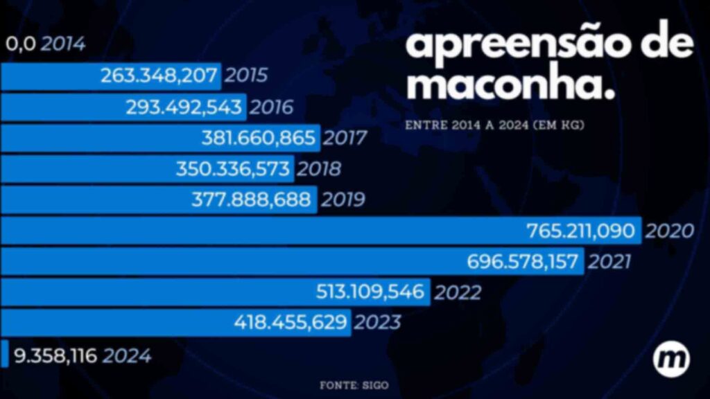 Ao comparar os números da Sejusp às apreensões realizadas pela PRF (Polícia Rodoviária Federal), os números tornam-se ainda mais preocupantes. Na última década, Mato Grosso do Sul liderou as apreensões de maconha em 7 dos 9 anos que compõem a série histórica da PRF.