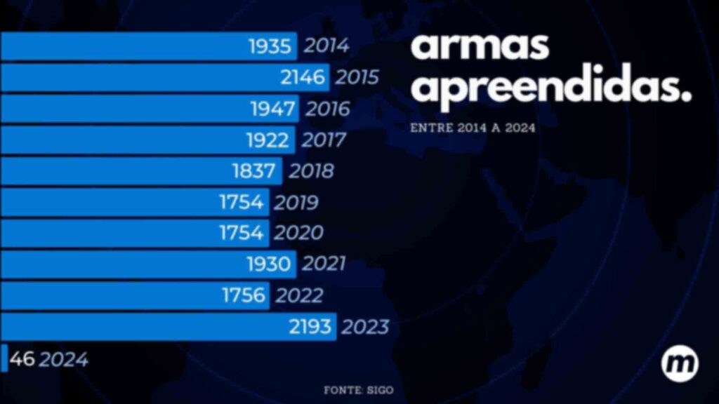 O ápice de ocorrências ocorreu em 2015, com 1.783 registros, resultando na apreensão de 2.146 armas. Vale destacar que os recordes de apreensões e ocorrências podem divergir, pois uma única ocorrência pode envolver um número expressivo de armas apreendidas.