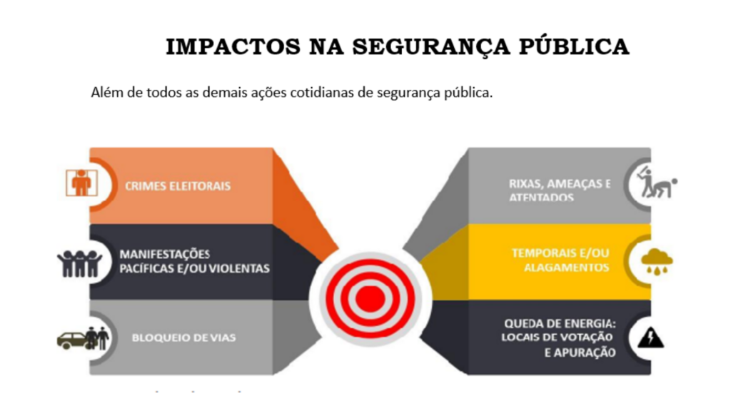 Os policiais estarão coibindo bloqueio de vias nesses locais, assim como atuarão caso haja manifestações pacíficas ou violentas. Estão prontos para atuar em queda de energia, temporais e alagamentos, além de coibir rixas, brigas, ameaças e crimes eleitorais.