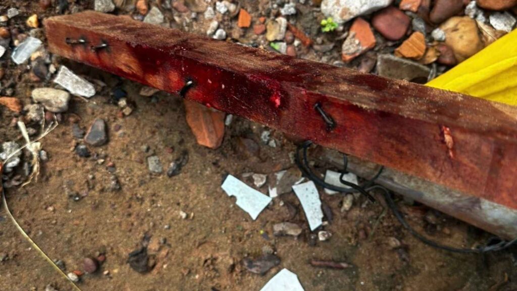 Em seguida, ‘Pilha’ foi embora, mas retornou pouco tempo depois acompanhado de outro homem – ainda não identificado – e os dois passaram a agredir a Celso com pedaços de madeira e viga.