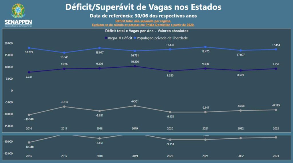 Na data de referência, a população carcerária era de exatamente 17.454 mil pessoas em celas físicas, com 4,364 em prisão domiciliar. Além destes, o sistema também aponta 255 presos custodiados por polícias judiciárias, Batalhões de Polícia e Bombeiros Militares.