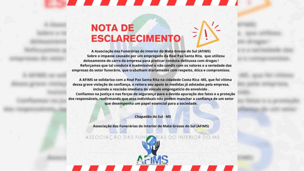 A AFIMS (Associação das Funerárias do Interior do Mato Grosso do Sul) emitiu uma nota de esclarecimento sobre a Operação Catafalco, deflagrada em Costa Rica, a 384 quilômetros de Campo Grande, na manhã desta quarta-feira (5).