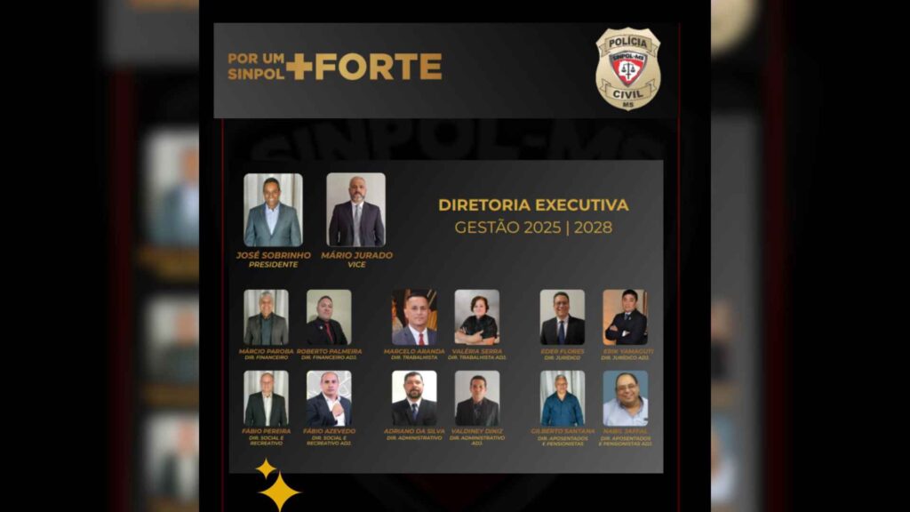 Em novembro do ano passado, o Sinpol-MS divulgou que a Chapa 1 “Por um Sinpol mais forte” venceu com 561 votos válidos a eleição para a diretoria executiva na gestão de 2025 a 2028.