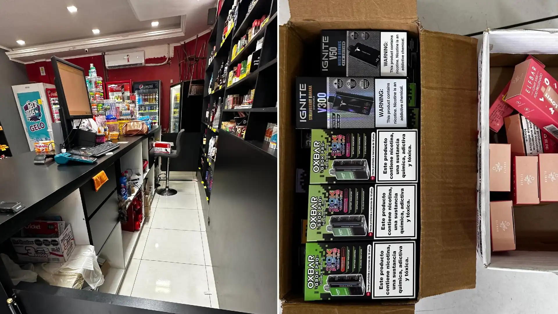 Durante a fiscalização, os policiais localizaram 25 unidades de cigarros eletrônicos escondidos embaixo do balcão, além de bebidas alcoólicas de origem estrangeira sem documentação fiscal, caracterizando descaminho, e alfajores importados sem certificação da Anvisa, considerados impróprios para consumo por não apresentarem procedência regular.