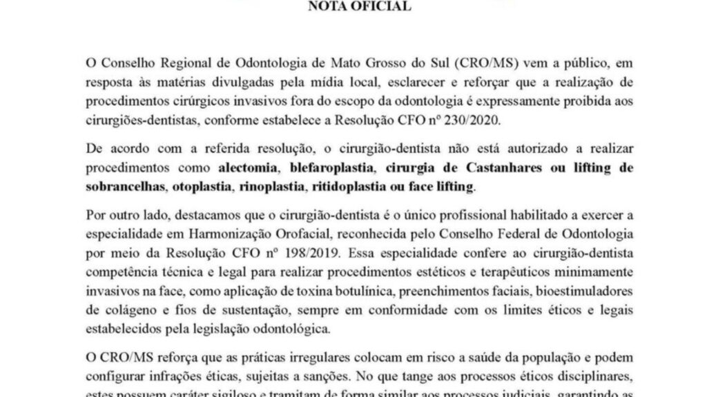 Em nota, o conselho relatou que procedimentos blefaropastia, rinoplastia, otoplastia, lifting não podem ser realizados pela dentista. Ainda segundo a nota, procedimentos cirúrgicos invasivos fora do escopo da odontologia são expressamente proibidos.