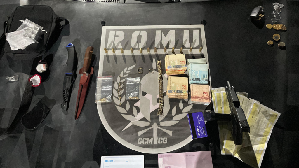 Além da arma, foram encontrados R$ 4,1 mil, um celular da marca iPhone, duas facas, uma pochete preta, uma pulseira masculina, uma pulseira feminina, um anel, um par de brincos, duas pepitas aparentemente de ouro, entre outros acessórios, e um cartão.