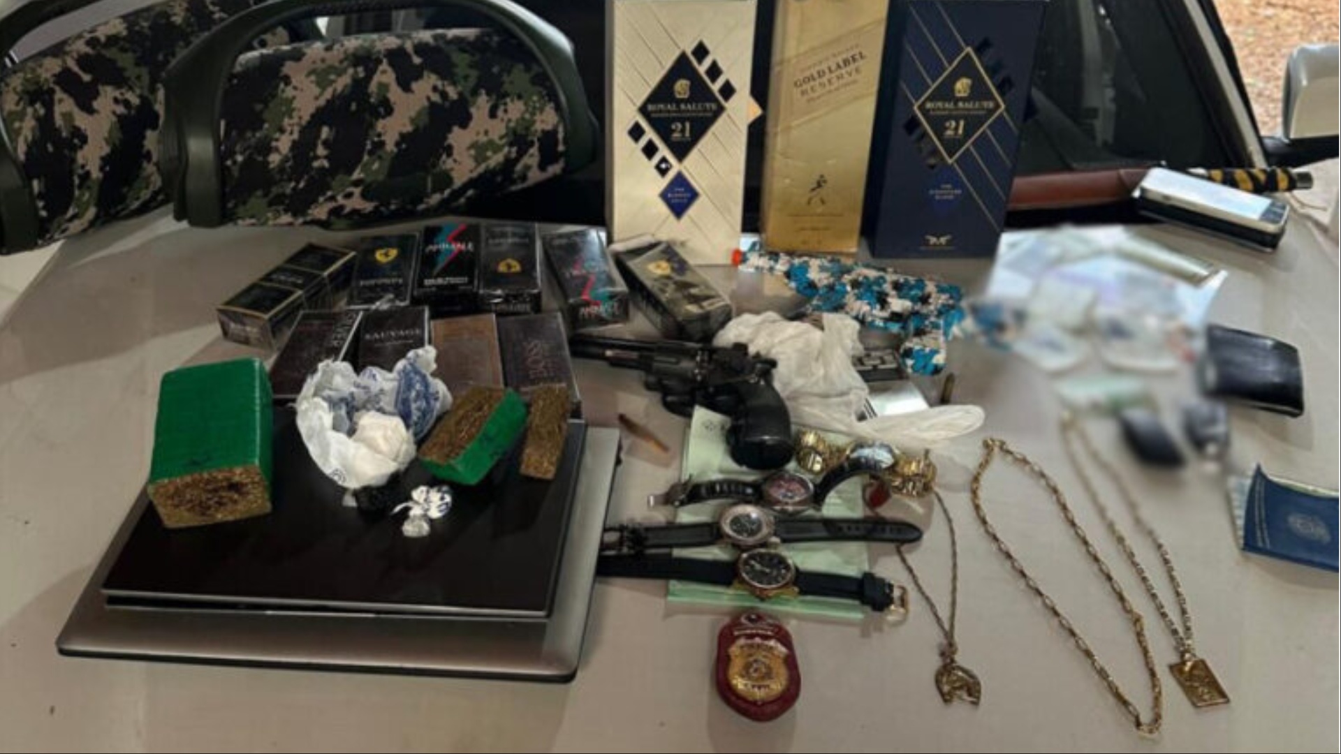 Durante o cumprimento dos mandados, uma pessoa foi presa em flagrante por tráfico de drogas e posse ilegal de munições. Também foram apreendidos três correntes de ouro, dois veículos, sendo um Toyota Corolla 2016 e uma BMW 2015, além de um bloco de atestados médicos falsificados e diversos dispositivos eletrônicos, entre eles celulares, computadores e notebooks — que passarão por perícia técnica.