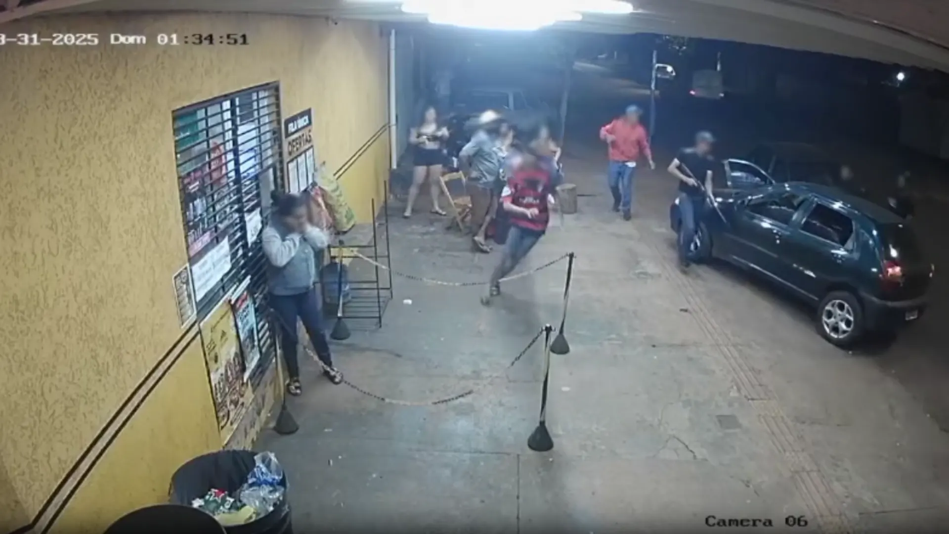 As imagens de segurança mostram o momento em que três homens chegam ao local em um Fiat Palio verde. Enquanto um deles se dirige à loja, os outros dois se envolvem em briga com outros clientes que estavam na calçada.