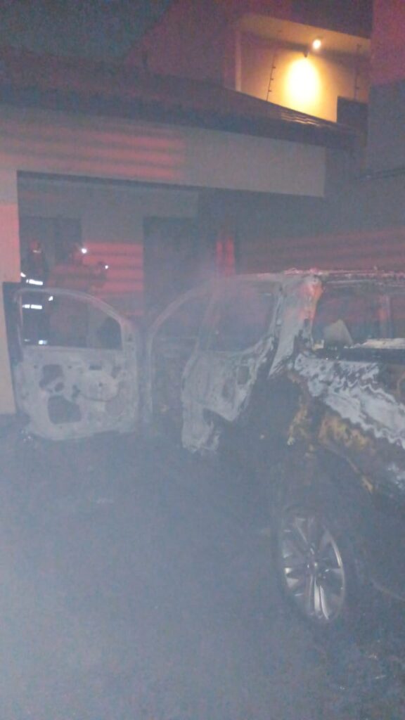 Imagem mostra a Fiat Strada onde um homem de 50 anos foi encontrado morto, dentro da casa, onde uma mulher de 40 anos também foi encontrada sem vida. Os dois ficaram com os corpos carbonizados, devido ao incêndio na residência, no bairro Monte Castelo, em Campo Grande, na noite desta quinta-feira (2). Na imagem aparece o veículo totalmente destruído pelo fogo.
