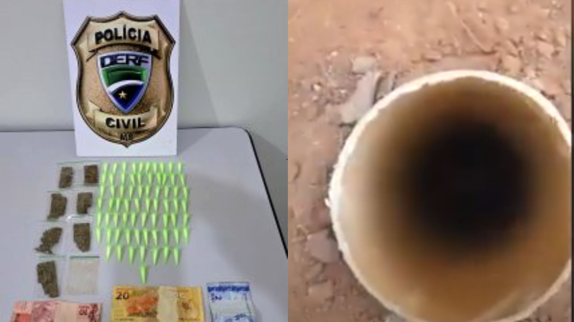 Durante a ação, outro homem foi flagrado retirando uma sacola plástica com droga de um cano de esgoto. Na sacola, havia 69 pinos com cocaína, 7 porções de maconha e R$ 55.