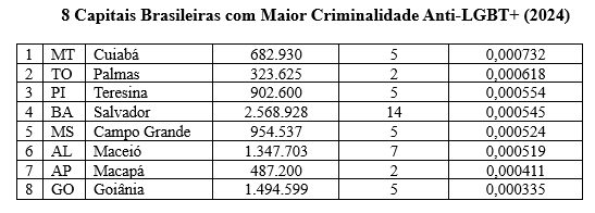 Ainda segundo os dados, entre as capitais com os índices mais elevados de criminalidade anti-LGBT+, o município de Campo Grande ocupa a quinta posição no ranking. E, além disso, assume colocação quando se diz sobre as capitais mais violentas para a comunidade.