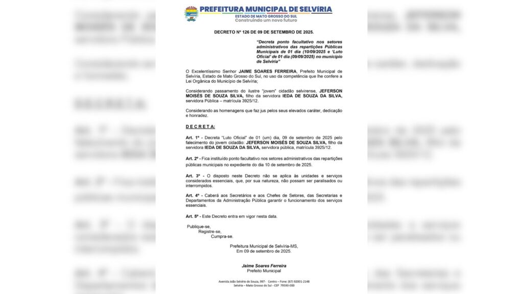 Em respeito à memória do rapaz, foi decretado luto oficial de um dia e ponto facultativo, conforme o Decreto nº 126 dessa terça-feira (9). “Decreta ponto facultativo nos setores administrativos das repartições Públicas Municipais de 01 dia (10/09/2025) e ‘Luto Oficial’ de 01 dia (09/09/2025) no município de Selvíria”.