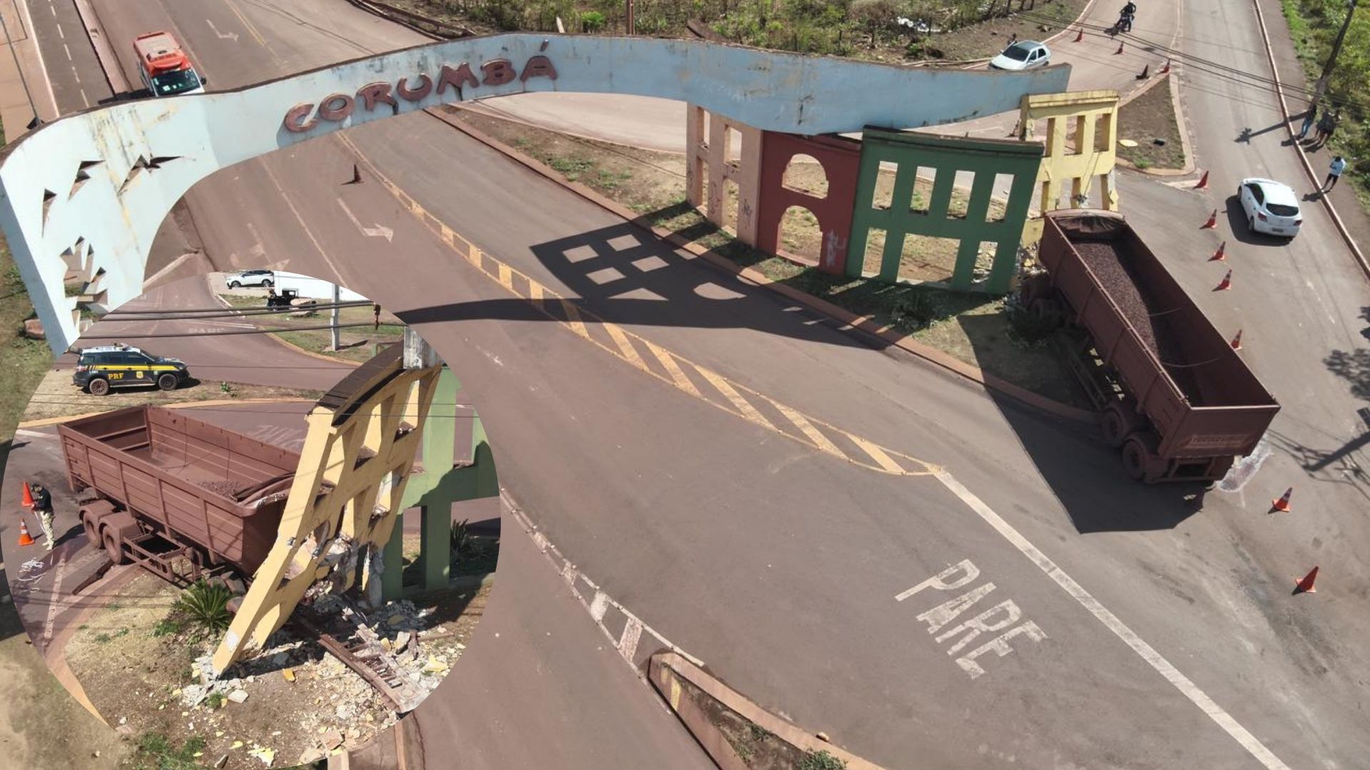 O semirreboque de uma carreta se soltou e atingiu o monumento do portal de entrada de Corumbá, a 429 quilômetros de Campo Grande. O acidente ocorreu na madrugada deste domingo (19) e, apesar do forte impacto, não há registro de feridos.