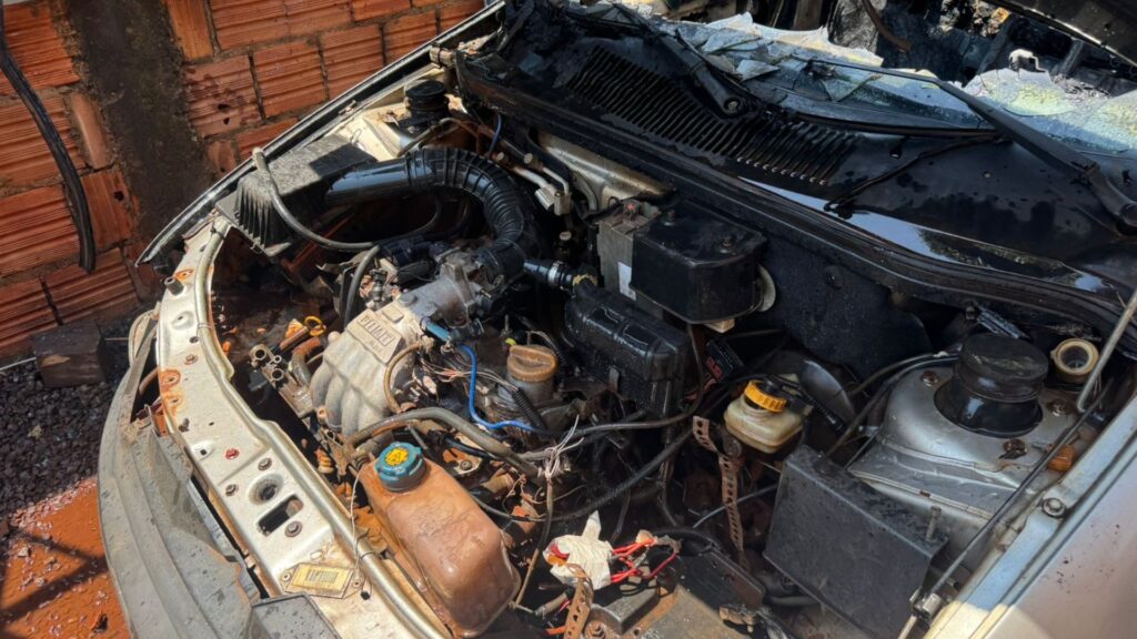 Apesar do incêndio no carro, a parte do motor ficou preservada e vai servir para o comércio de peças. As chamas se propagaram e atingiram o porta-malas de outra sucata.