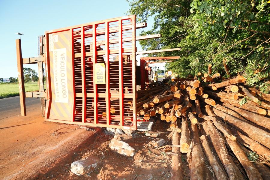 Uma carreta carregada com toras de eucalipto tombou na BR-163, próximo a rotatória na saída para São Paulo, na tarde desta terça-feira (19). Não há informações sobre o que pode ter causado o acidente.