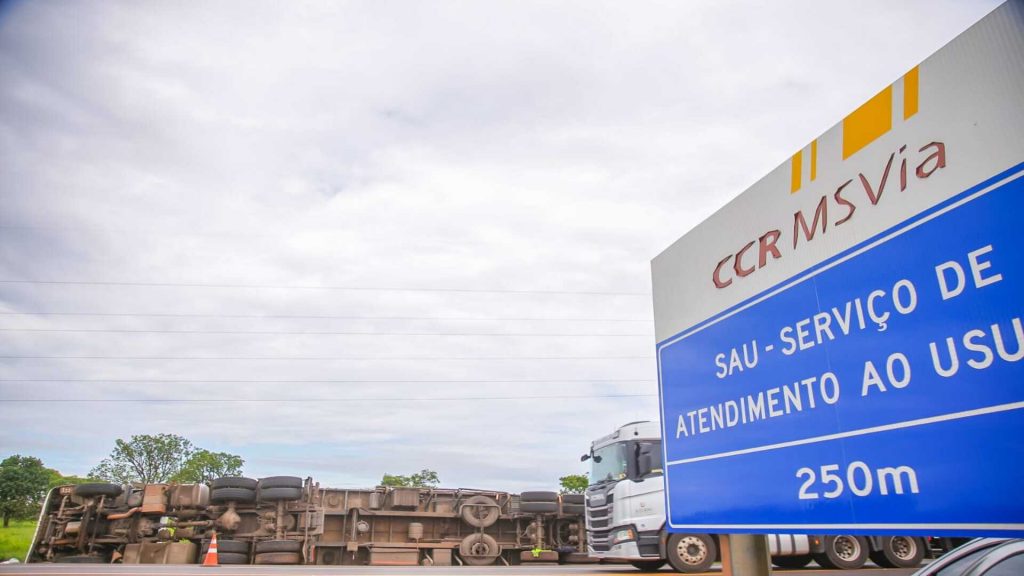 Uma carreta articulada, carregada de pluma de algodão, está tombada há mais de 24 horas no Anel Viário da BR-163, em Campo Grande, entre a entrada do Residencial Dhama e o Posto Caravaggio. O acidente ocorreu na manhã desse sábado (3), mas na manhã deste domingo (4) o veículo ainda estava no local.
